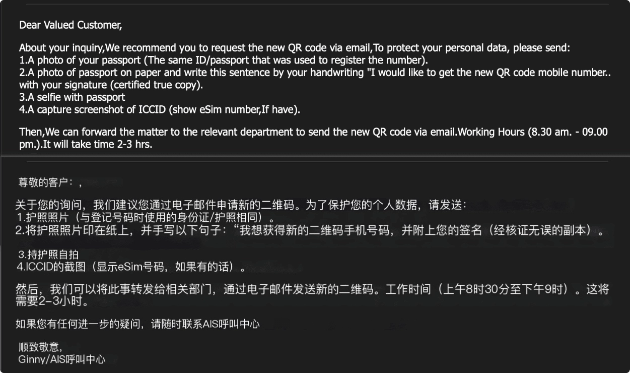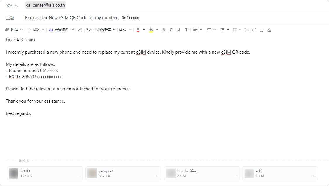 由于是我们是通过 Redtea Go 平台购买的 AIS eSIM ,可能存在被红茶停用的风险。我们联系 AIS 客服申请新的 eSIM 二维码。本操作建议至少在套餐 8 日流量套餐过期之前完成。需要准备和发送的材料包括: