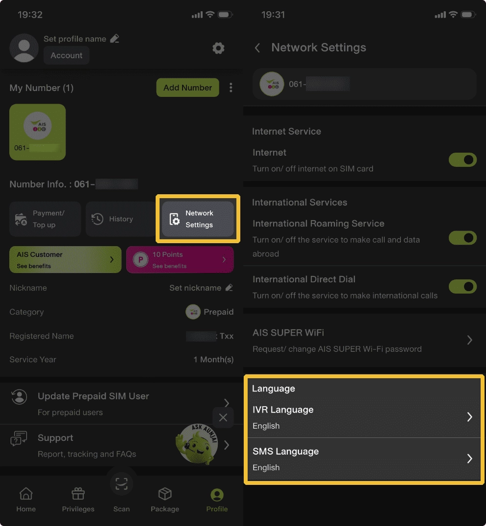 - 完成注册后,进入MyAIS首页,您可以在“Profile”中查看号码信息和有效期。
