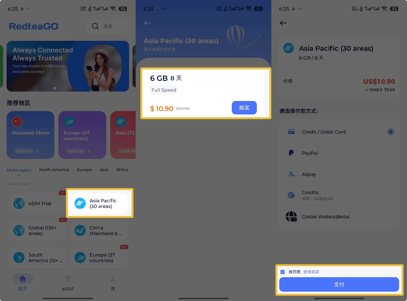 在 Redtea GO 应用中选择“亚太地区”并购买 8 天 6GB 亚洲漫游数据套餐。付款支持支付宝、苹果支付、信用卡、PayPal等多种支付方式。