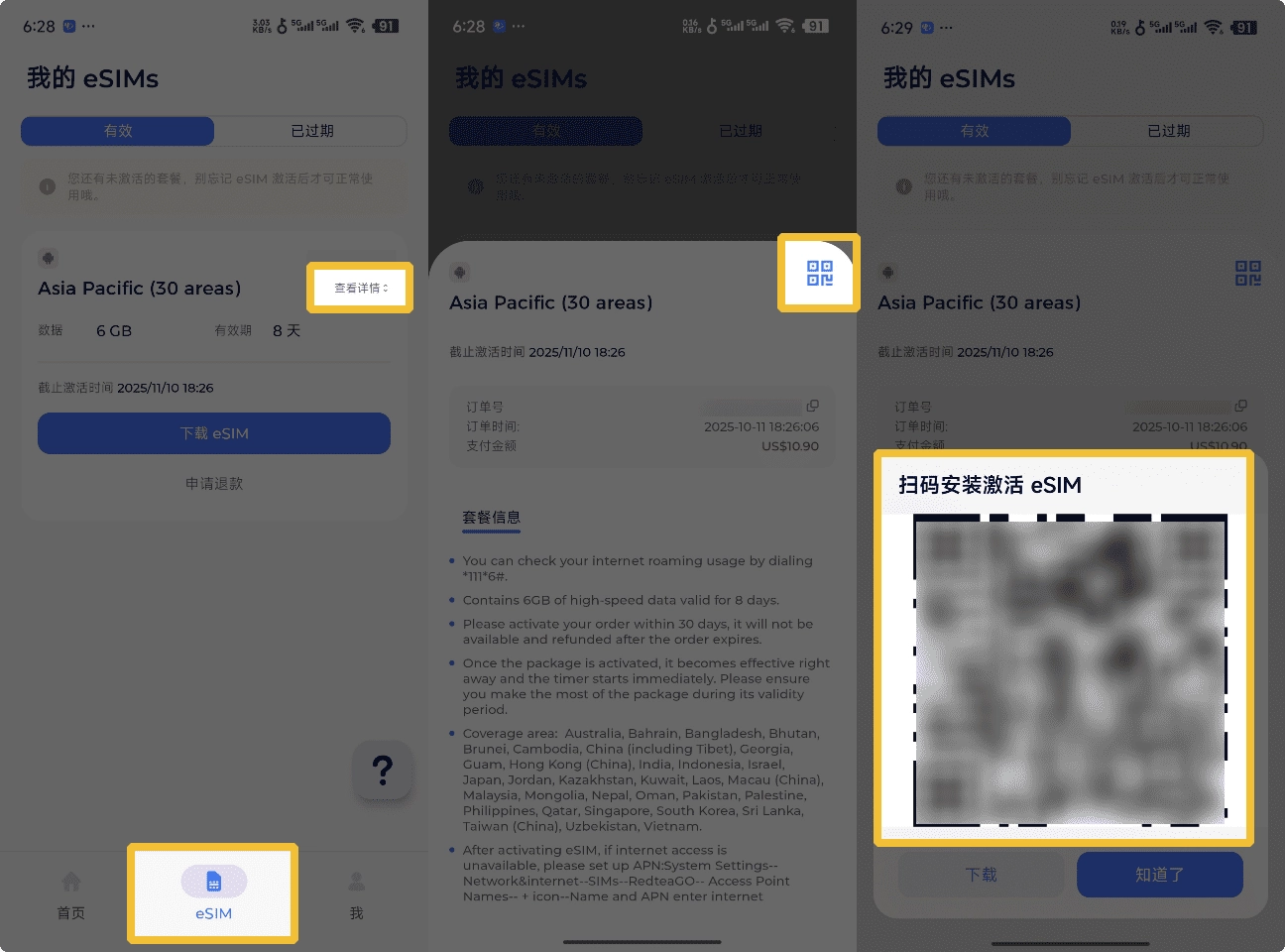 支付成功之后,在 Redtea GO 中查看已购买的 eSIM,点击查看详情。点击二维码图标可以看到 eSIM 信息。