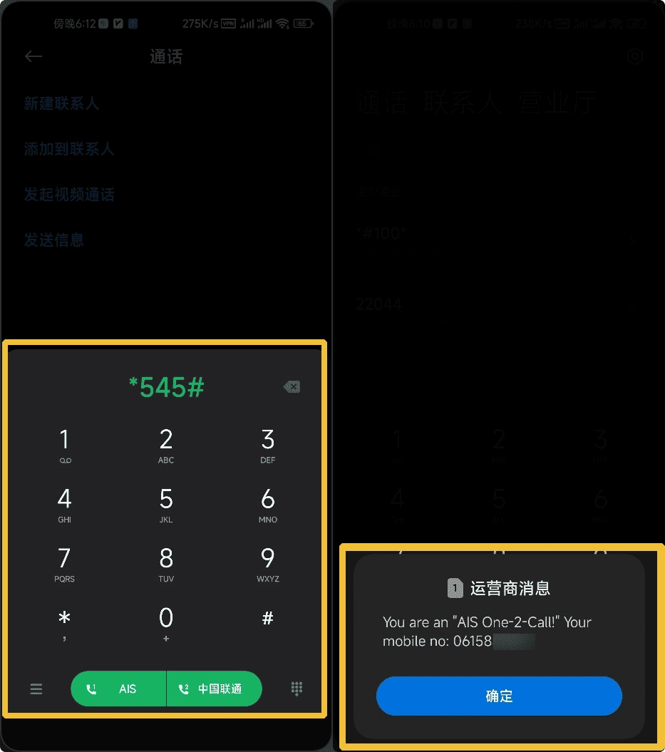 eSIM 写入成功并激活后,通常会收到包含手机号码的欢迎短信。随后,可通过拨号界面输入 USSD 代码 *545#手动查询本机号码,系统会返回您的手机号码:061*******,记住备用。