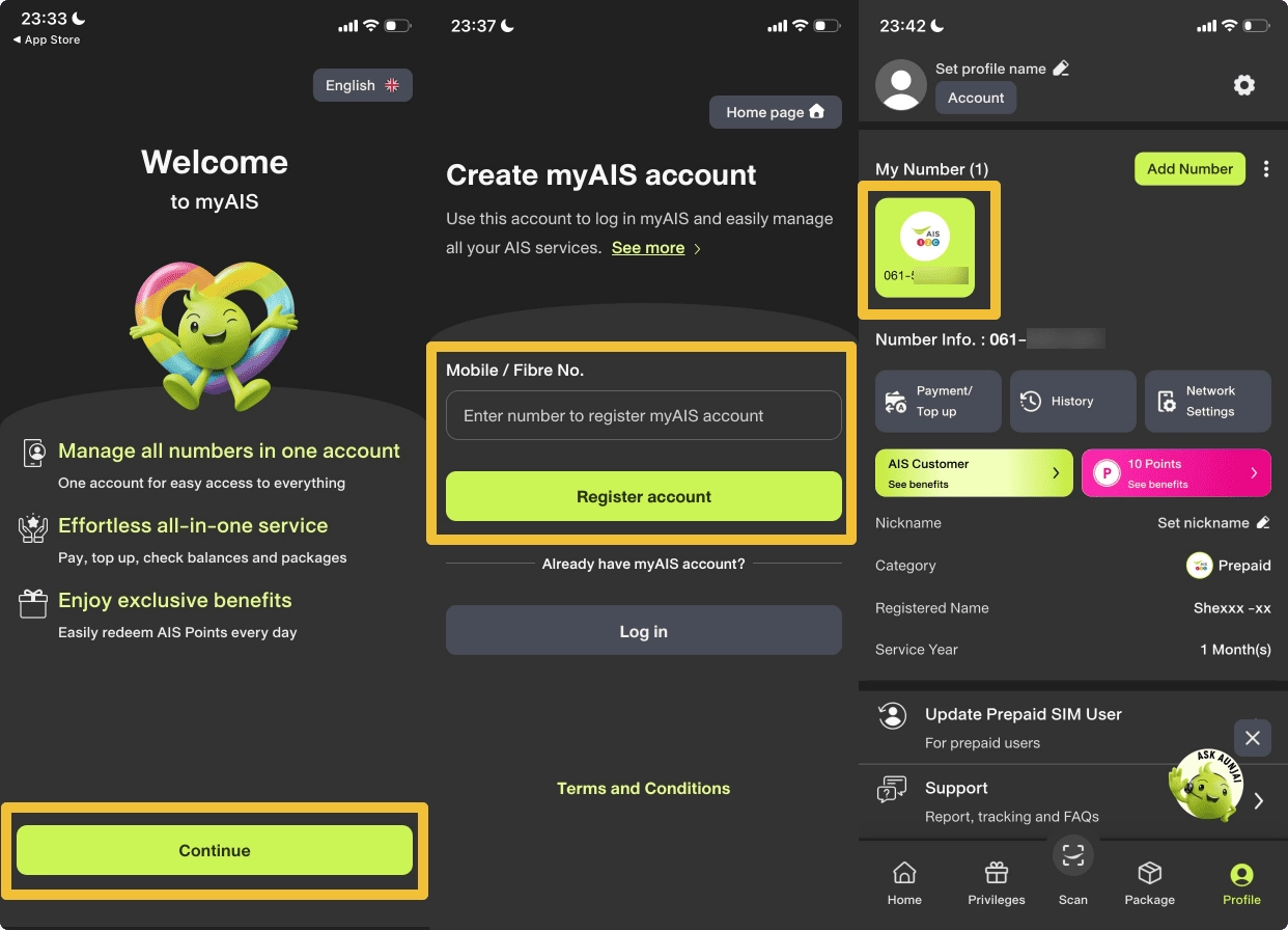 - 打开 MyAIS 应用,点击“Continue”,输入刚才通过