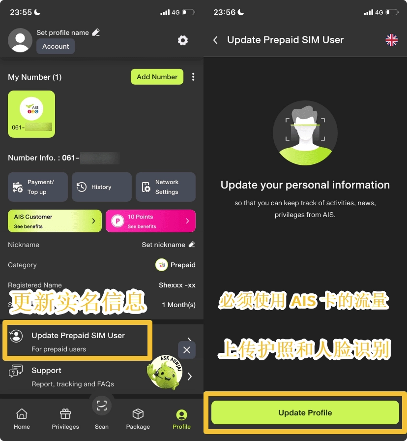 - 在 MyAIS 应用中,进入“Profile”页面,点击“Update Prepaid SIM User”,然后选择“Update Profile”。