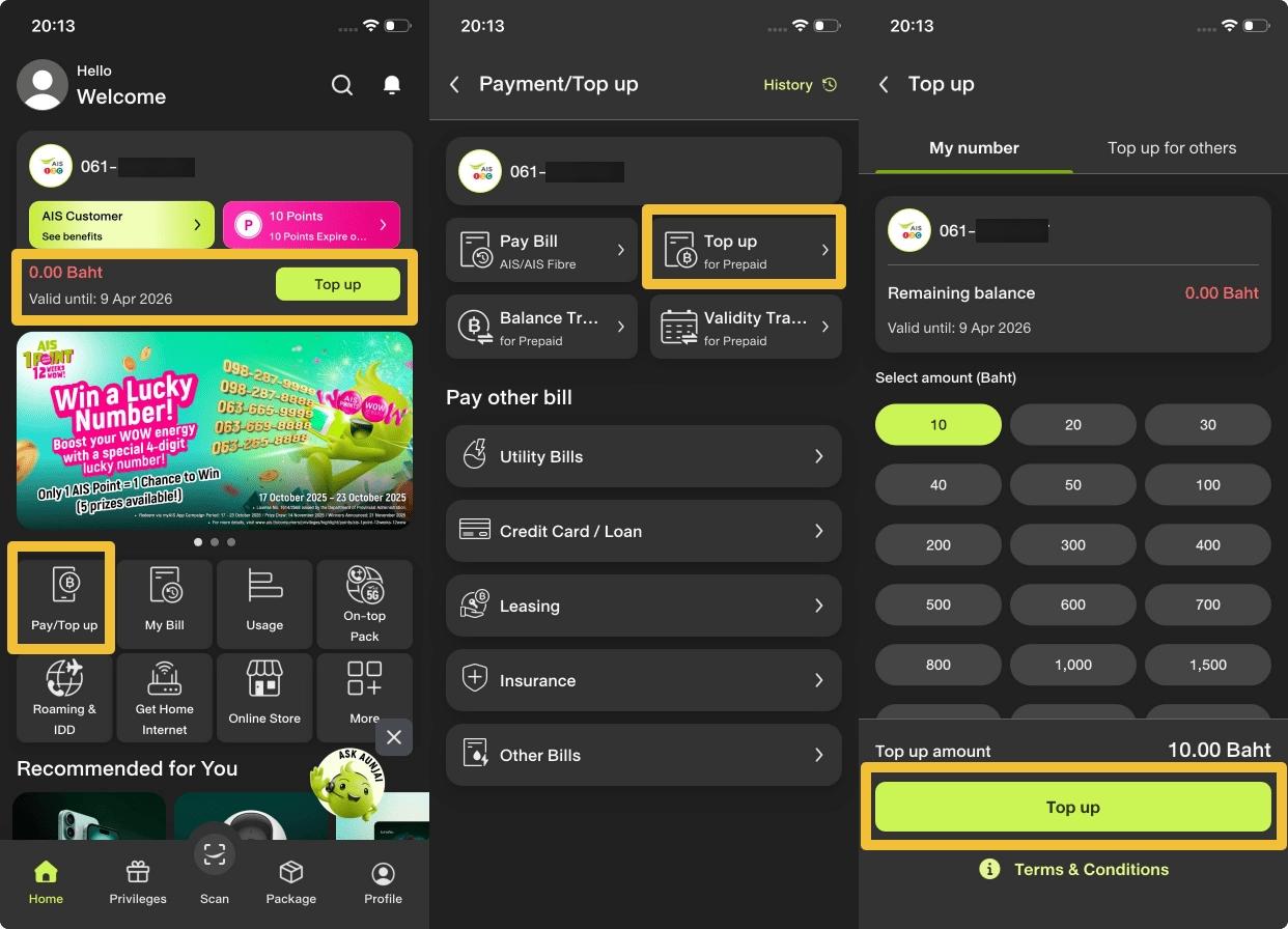 - 每月充值:在号码有效期内,每月充值最低 10 泰铢(约 0.3 美元),可延长有效期一个月,最长可累积延长一年 。