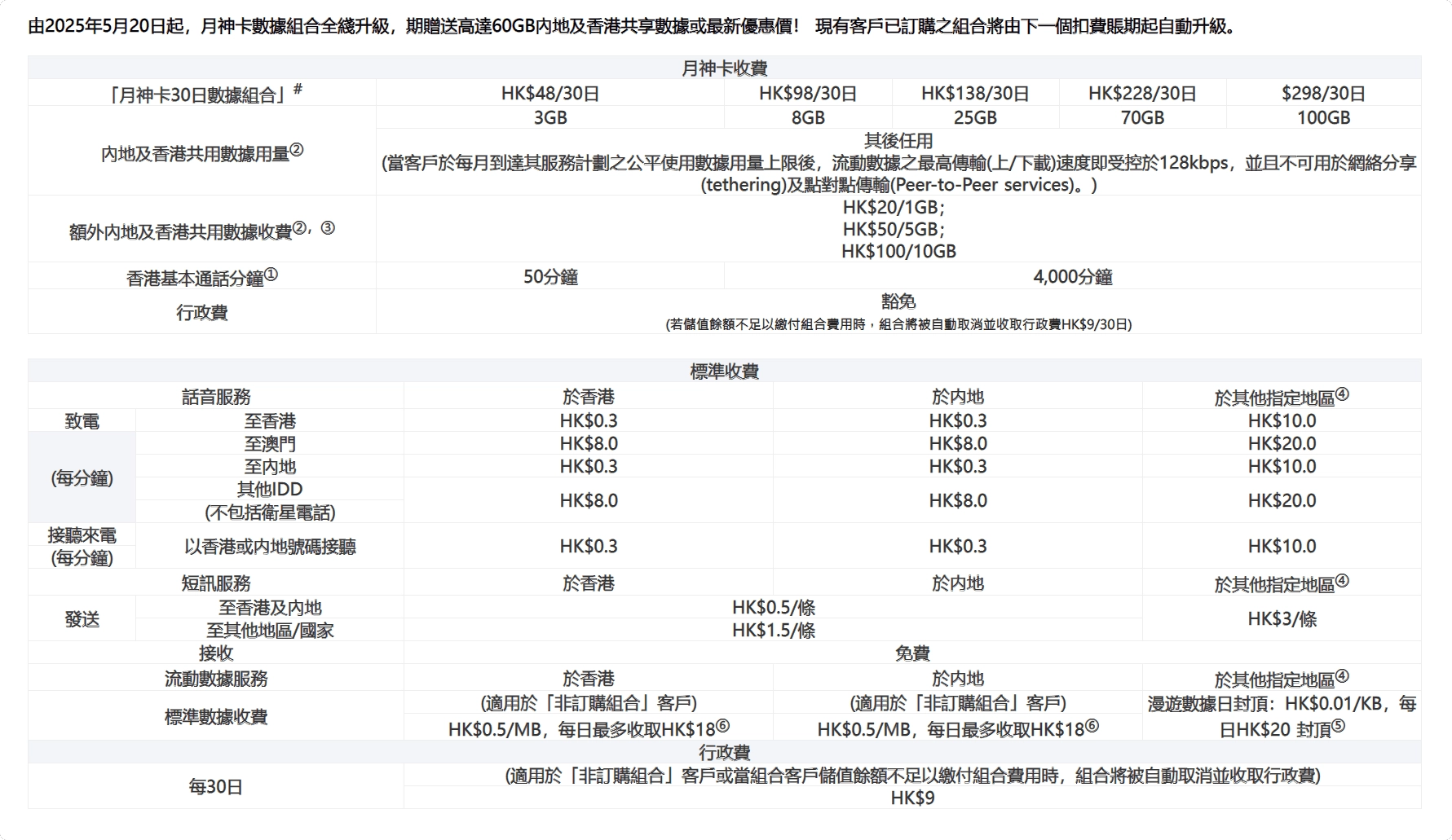 - 丰厚流量赠送:部分套餐会额外赠送高达 60GB 的内地和香港共享数据流量,满足用户在两地的上网需求。