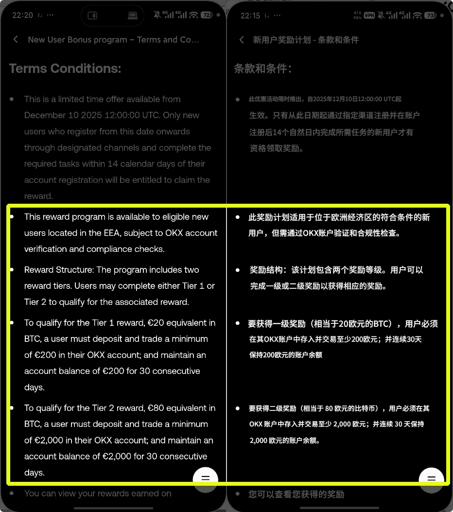 - 入金并交易至少 €200,并且连续30天保持账户余额为200欧元,即可解锁 €20 的 BTC 奖励,另外还有德区欧易的专属空投奖励