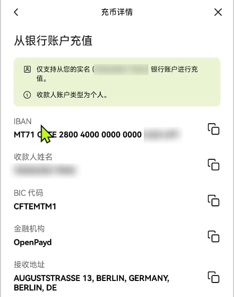 完成德国区认证后,你将获得一个以 MT 开头的 个人 IBAN 账户,由 OpenPayd Malta Ltd 提供: