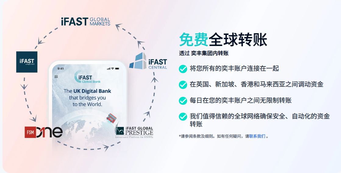 ✅ 全球免费转账:iFAST集团内的全球免费转账到香港,新加坡和马来西亚,支持英国内英镑免费转账,免费入金Wise英镑账户