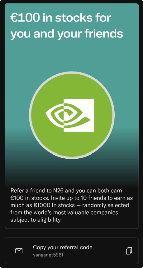 使用本站专属 注册链接 或 邀请码 yangangt5961 注册开户,并在活动期间完成一笔 150 欧元以上的消费(可绑定微信、美团等支付),即可获得 100 欧元股票 奖励。