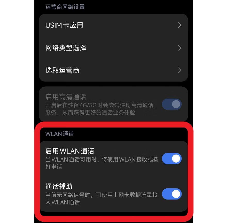 部分小米手机: 若没有该选项,需先在拨号界面输入*#*#869434#*#*,再进入“设置”启用“WLAN通话”。