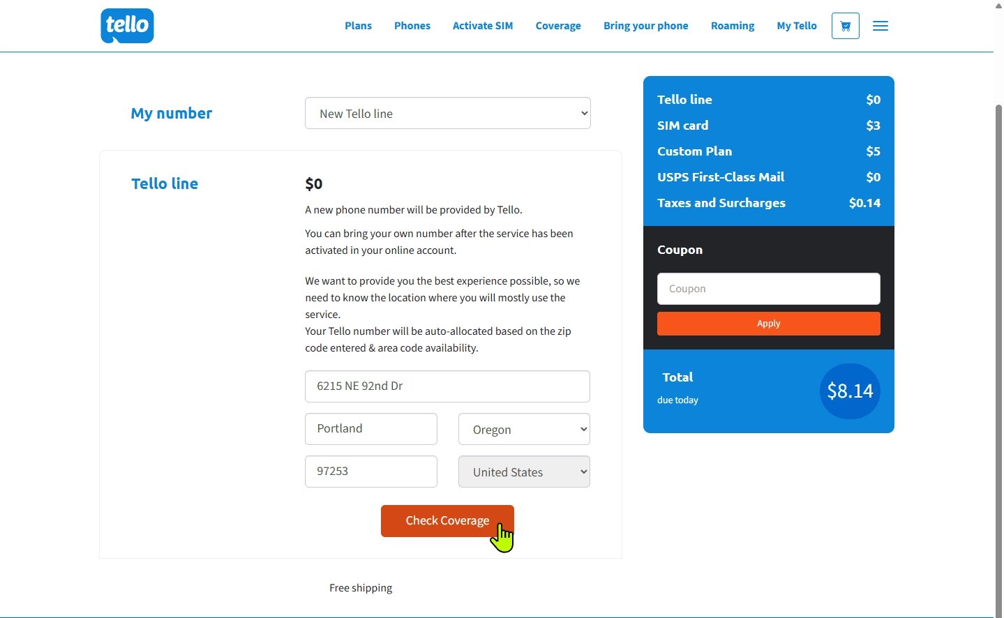 选择完套餐后需要先输入一个美国地址信息,这个地址只用来确认服务覆盖和分配你的号码归属地。我们这里可以用美国地址生成器或者谷歌地图随便找一个美国免税州的私人住宅地址。填写之后点击 Check Coverage