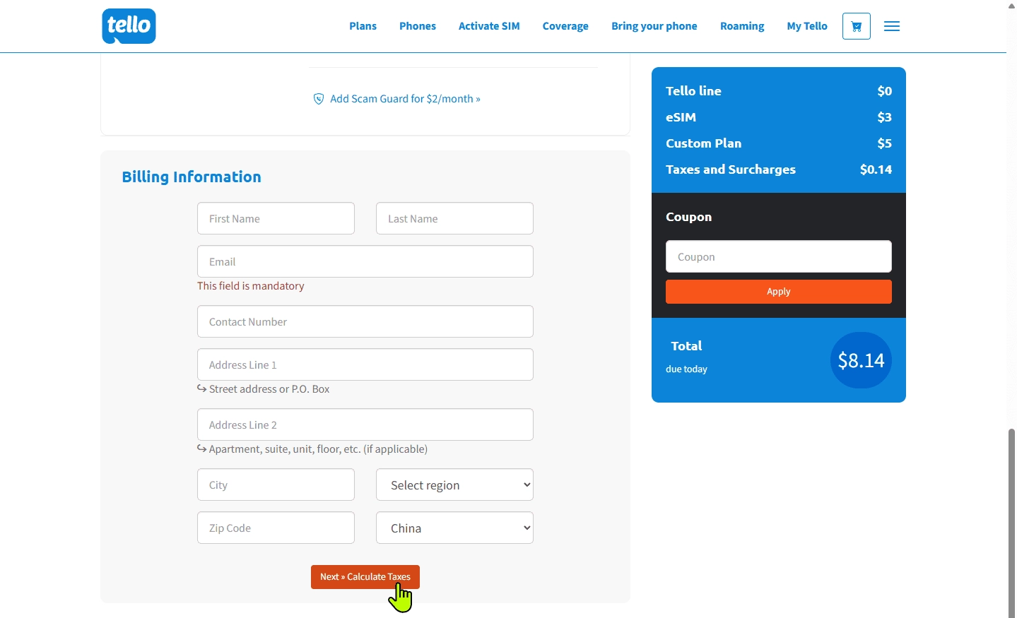 Tello 任意套餐组合: