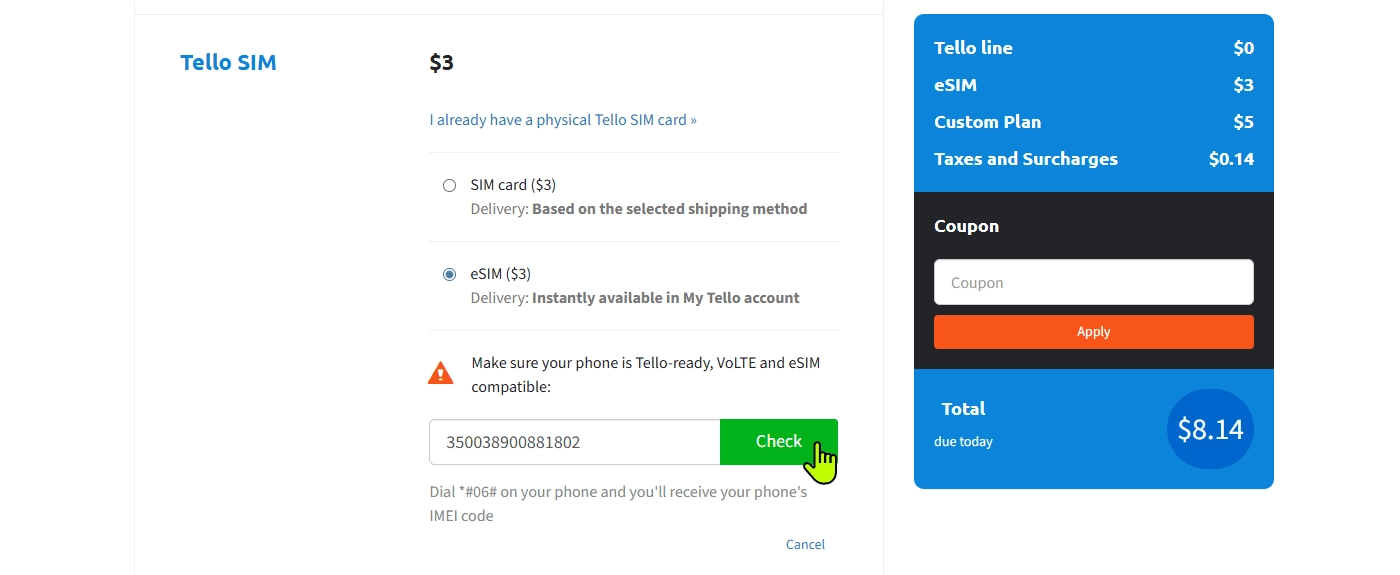 现在的 eSIM 和 SIM 卡都是 3 美元开卡费。实体卡还得邮寄,所以我们直接选择 eSIM ,需要输入一个手机 IMEI 来验证你的手机设备是否支持,我们直接通过在线 IMEI 生成器( 苹果| 安卓)随机生成一个通过校验即可。