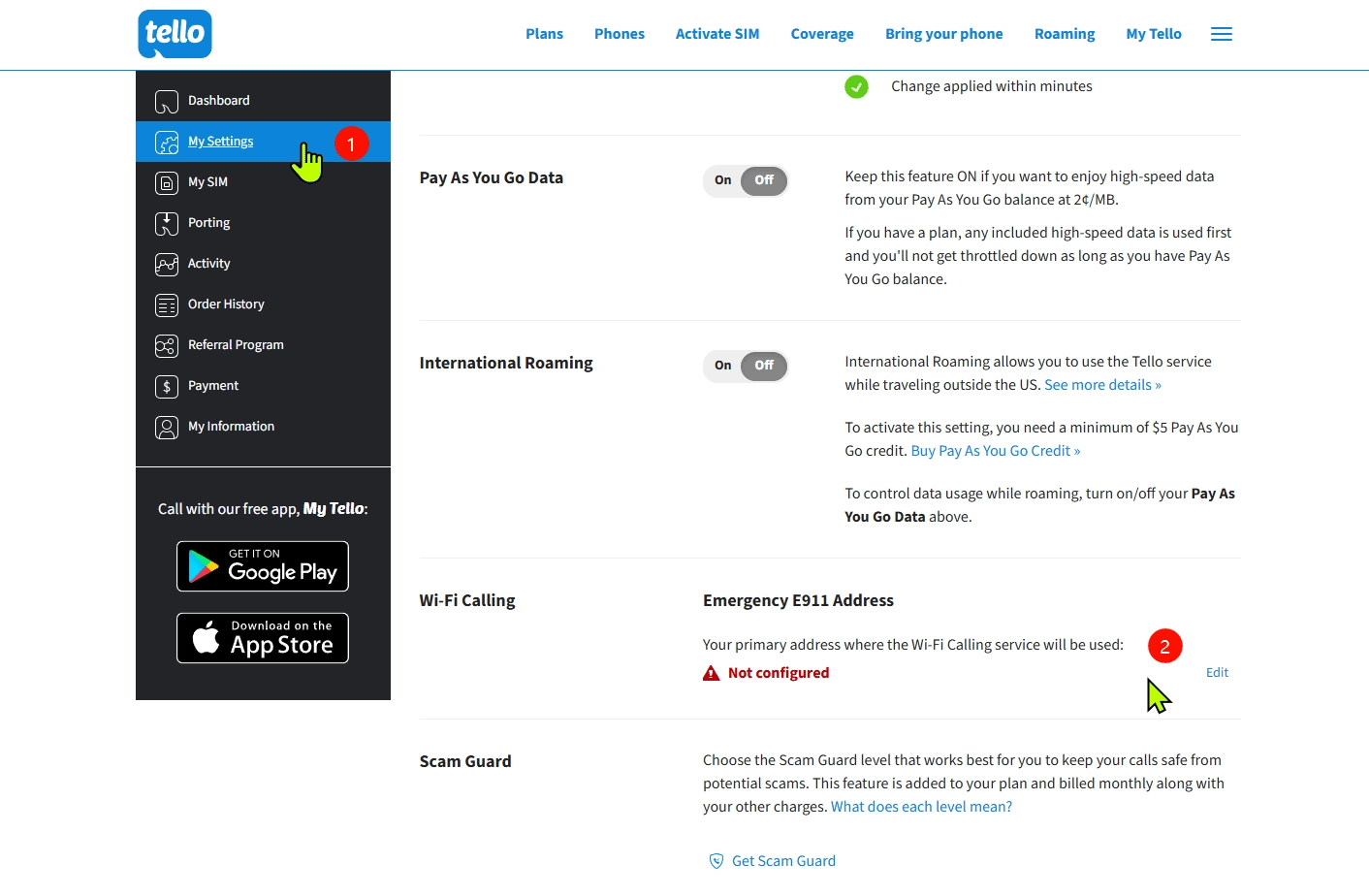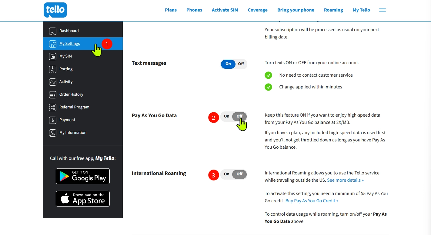 Tello 的 Pay As You Go 方案是一种灵活的与付费服务方式,使用前需要先充值至少 20 美元的 Pay As You Go Credit 后,到官网 My Settings 手动开启 “Pay As You Go Data“ 和 “International Roaming“ 选项。