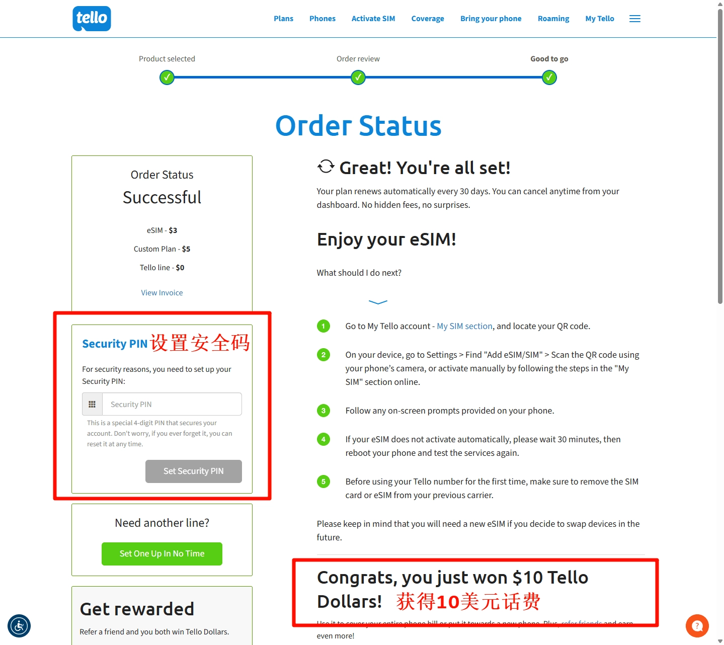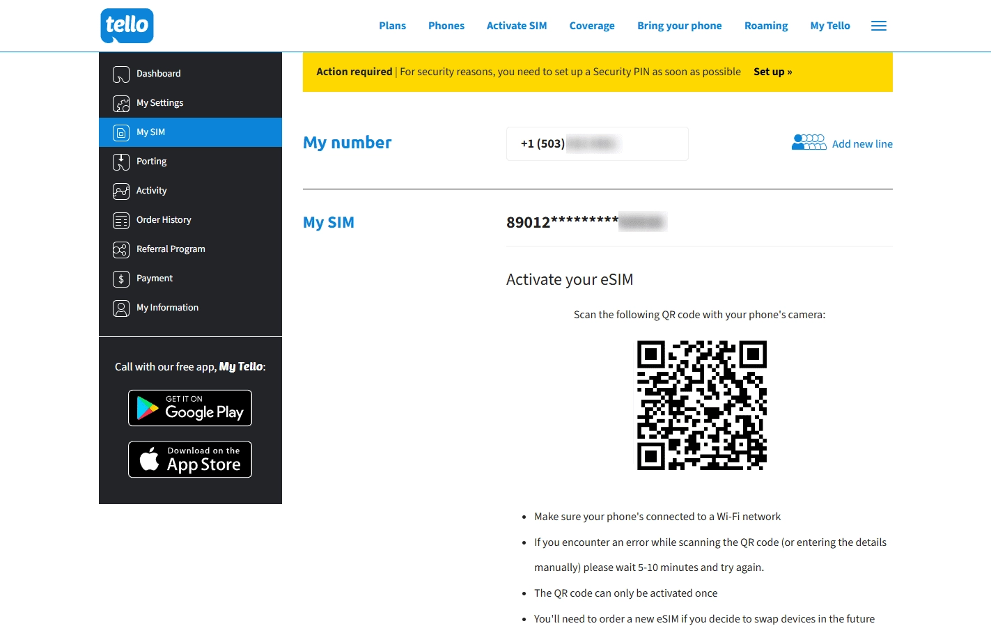 在此页面设置一个4位数字的 Security PIN(安全密码)。这个 PIN 在激活失败时,可以帮助你免费重新获取 eSIM 二维码。请注意,Tello 的 eSIM 二维码为一次性使用,无论激活成功与否,都无法重复使用。