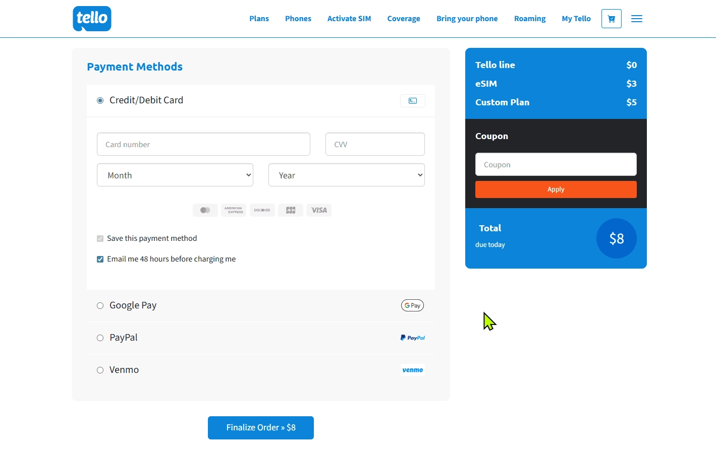 Tello 支持多种支付方式,包括信用卡/借记卡、Apple Pay(需 Safari)、Google Pay、PayPal 和 Venmo。但部分虚拟卡可能在支付时遇到“砍单”或失败。遇到这种情况,建议换用实体卡或其他支付方式。实测显示,国内银行发行的 Visa、Master 和 AmEx 都能成功付款。