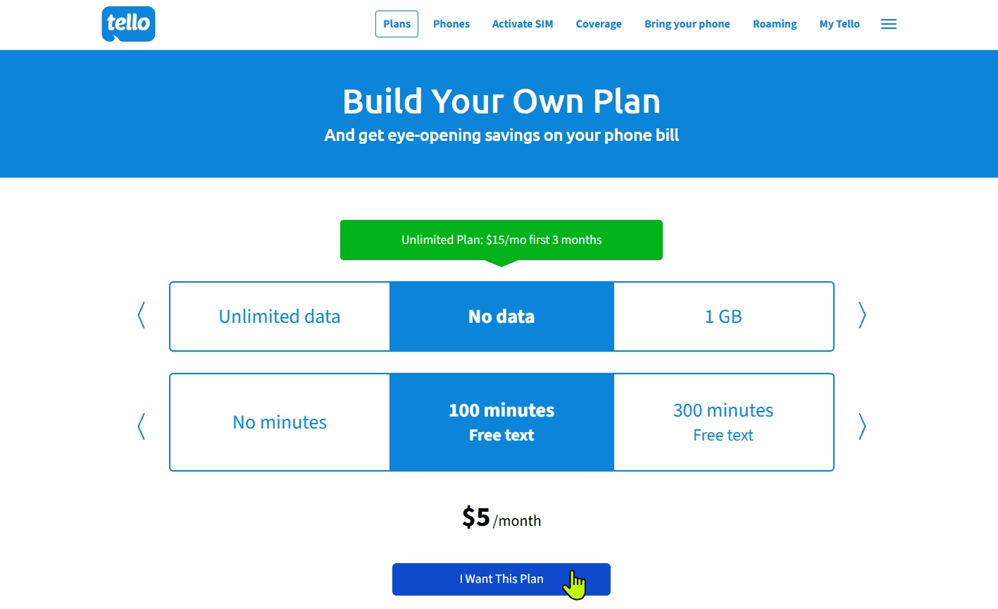 注册好账号点击 Plan 选择套餐,第一行是选择流量,第二行选择通话时长,点击左右箭头来定制适合自己的套餐。由于数据流量只能在美国本土使用,所以在中国漫游的话我们直接选 No data。根据自己的需要,选择适合的通话时长,有大量国际通话需求就选择 8 美元的无限通话套餐。我这里就以最低 5 美元含 100 分钟通话的保号套餐来演示,确认好套餐后,再点击 I Want This Plan 进行下一步
