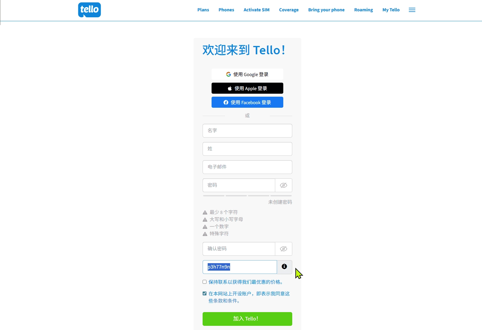 打开 tello 官网 进行账号注册,使用本站推荐链接或推荐码:P3H77N9N,注册并下单后,自动获得 10 美元的奖励,可以抵扣下个月话费。英语不好的朋友可以借助网页翻译。由于 tello 无需实名,所以姓名可以随意填写。依次填写 First Name(名),Last Name(姓),邮箱,设置密码,勾选服务条款后点击 Join Tello! 来注册一个账号。