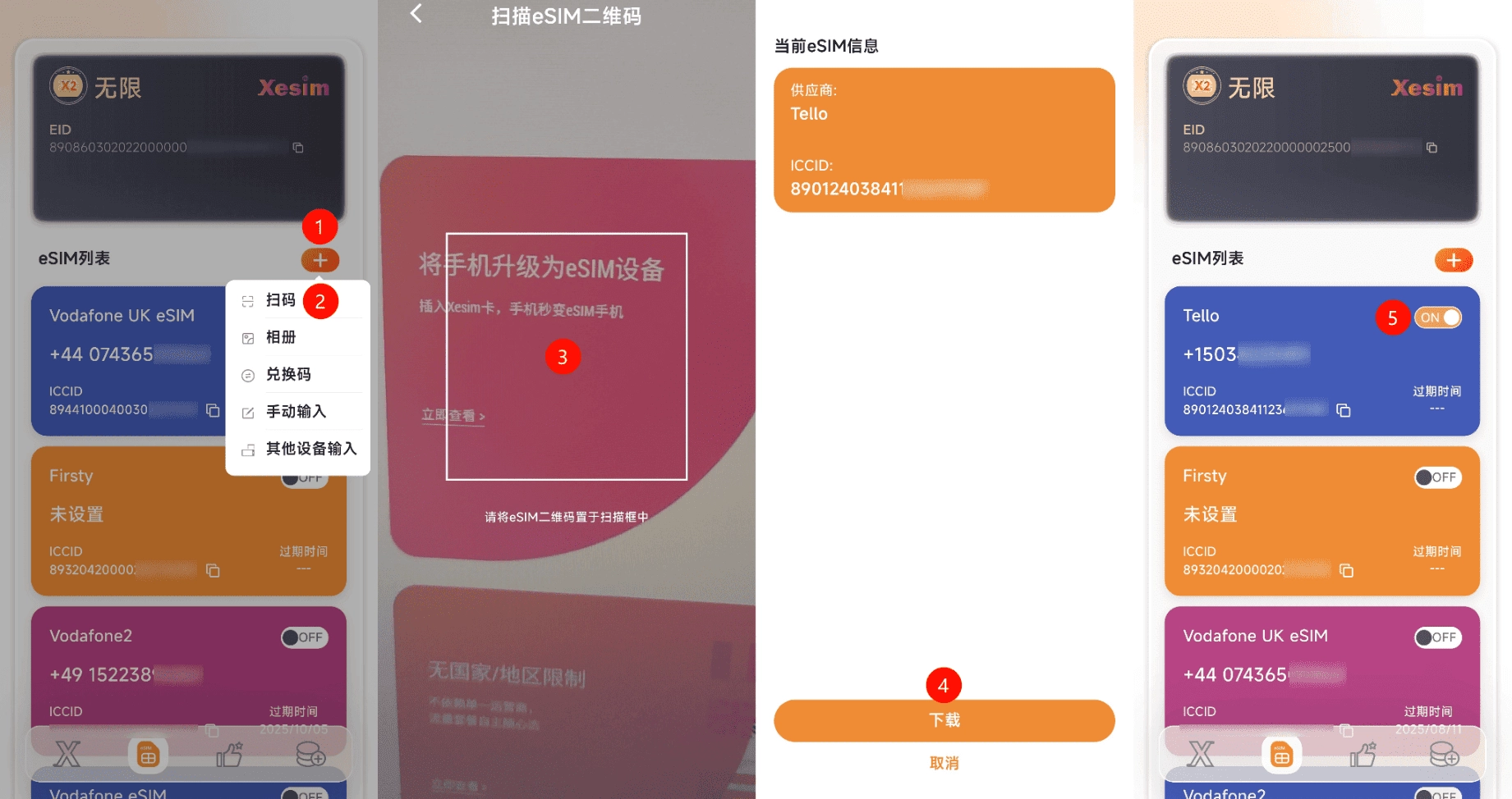 - 打开 Xesim App,点击“+”,选择扫描二维码。