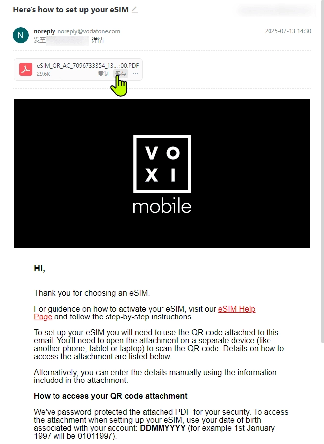 📍 6.等待 eSIM 文件:查收邮件,附件是含有 eSIM 激活代码的 PDF 附件,密码是出生日期