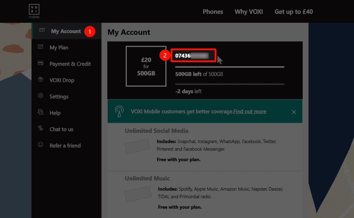 📍 8.查看手机号码:通过邮箱和密码登录 VOXI 官网,再填写短信验证码,后台点击 My Account 查看以 07 开头的本机号码,国家区号 +44