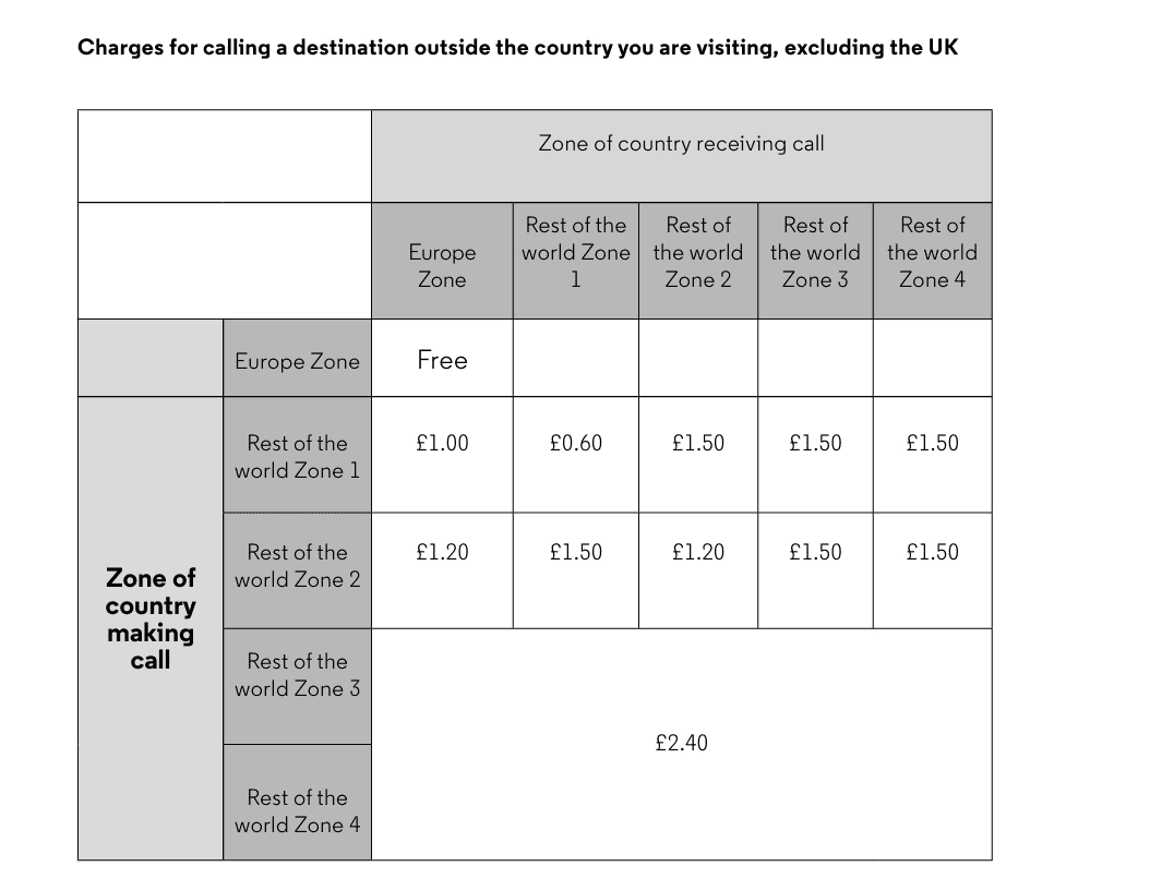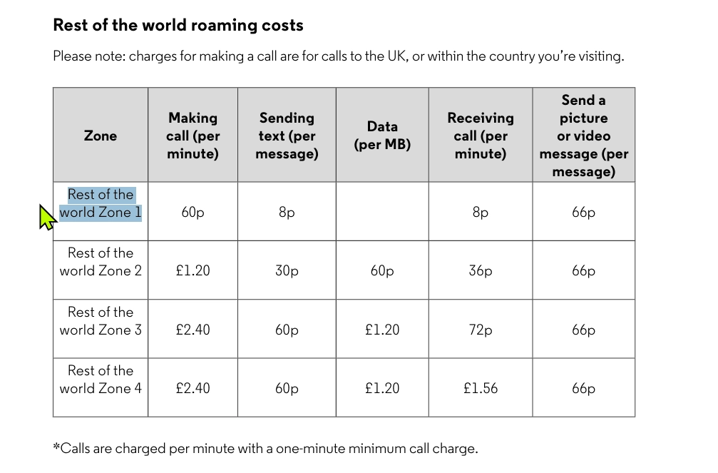 - 在中国向 UK 或中国内的通讯费用(*中国属于 Rest of the world Zone 1)